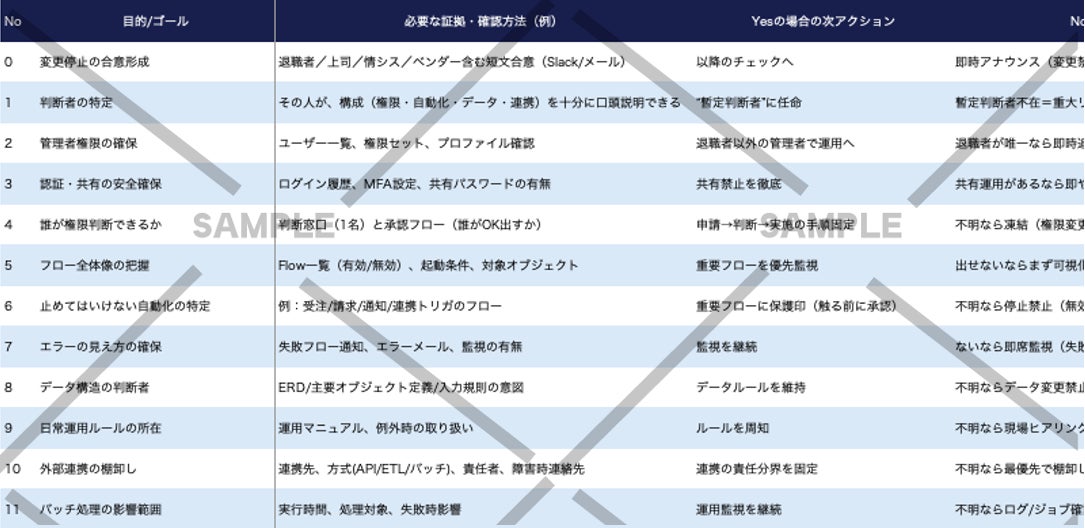「Salesforce管理者の退職が決まったときに企業が確認すべきポイント」を整理したチェックリスト(Excel)も無料配布しており、企業の実務でそのまま活用できる内容となっています。