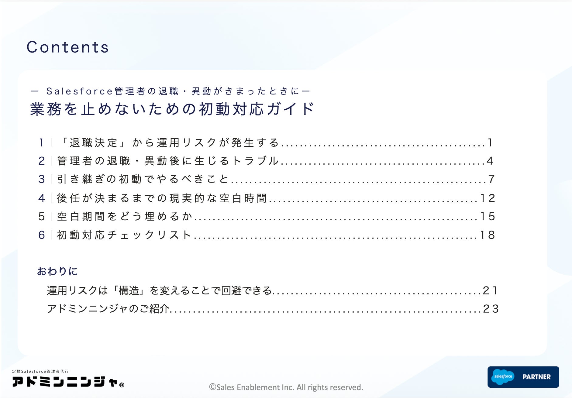 本資料では、Salesforce管理者の退職・異動時に発生するリスクと対応策について、以下の内容を解説しています。