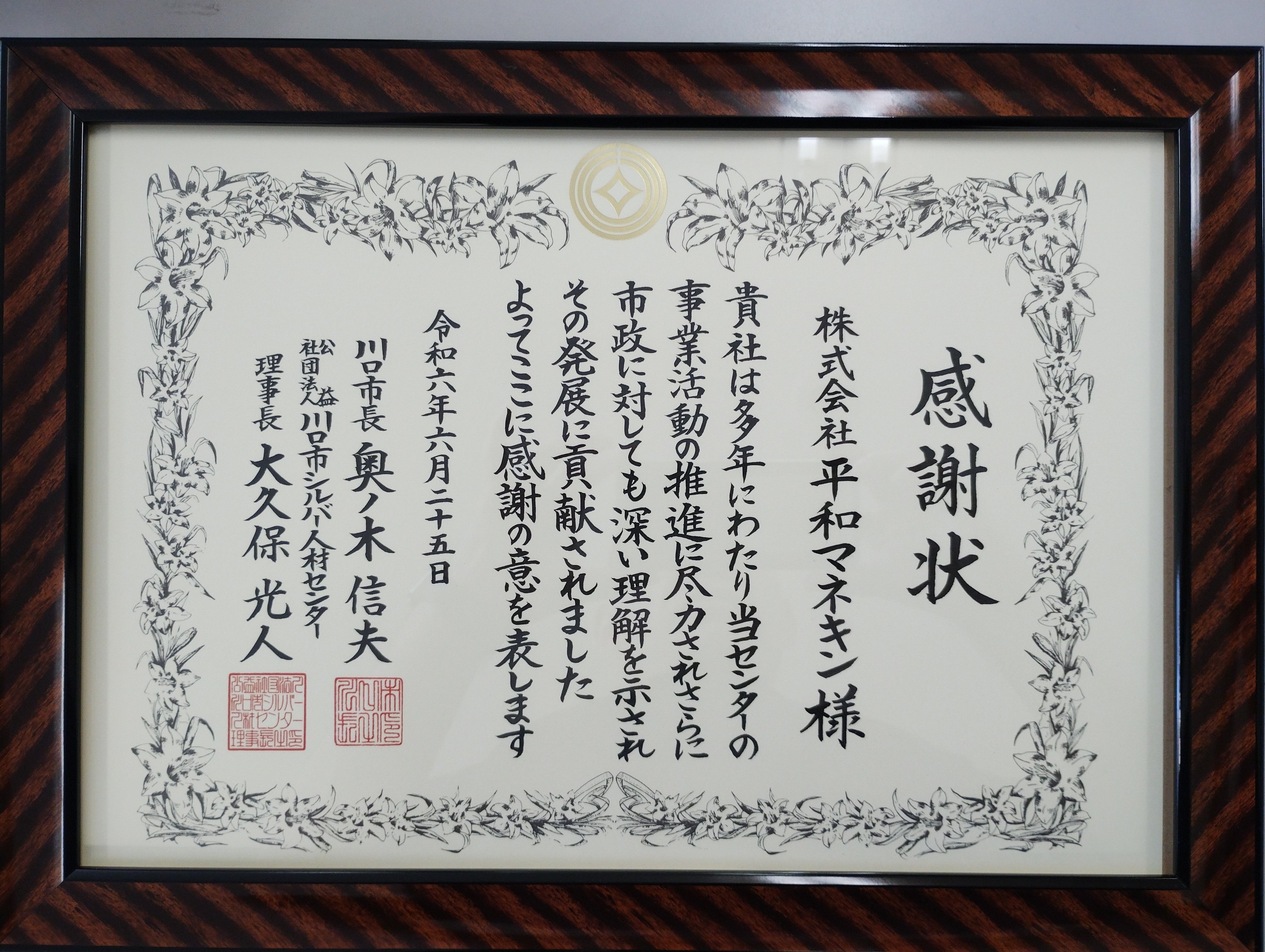 マネキンやディスプレイ什器の製作・レンタルや、商業施設の展示デザインやイベント企画・施工などの事業を展開する株式会社平和マネキン(本社:大分県別府市、本部:東京都豊島区、代表取締役:末次 広憲)は、埼玉県川口市のシルバー人材センターから、「感謝状」を授与されました。