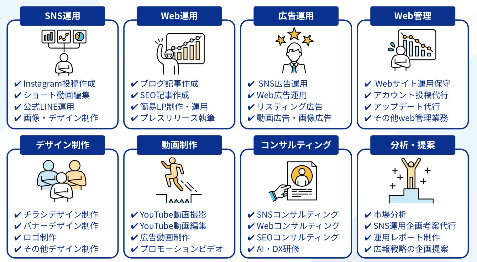 SNS運用(Instagram・TikTok・YouTubeなど)、SEO記事作成、広告運用、デザイン制作、動画編集など、Webマーケティング全般を網羅。広報や営業の「急な依頼」や「外注しづらい雑務」にも迅速に対応します。