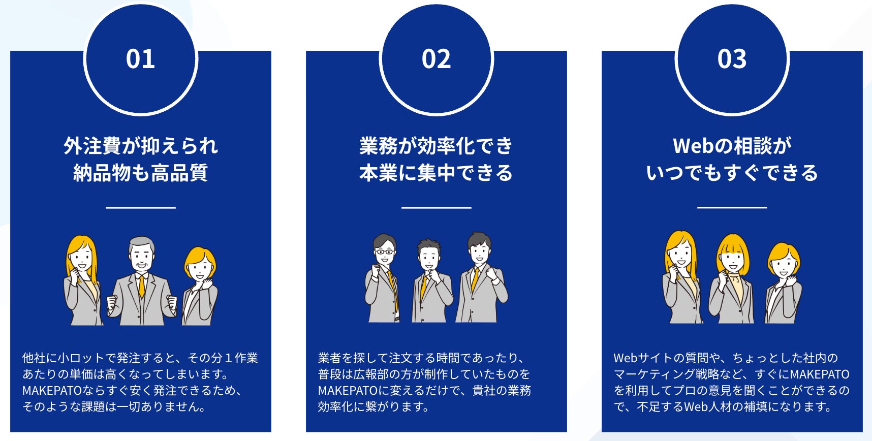MAKEPATOはマーケティングパートナーの略称で、WEB業務や広報業務の雑務を代行するサービスです。特に広報やマーケティングにおける『急なタスク』や『外注するほどではない小規模なタスク』に対応し、これまでの外注に伴う多大なコストや手間の課題を解消する画期的な仕組みを実現しました。