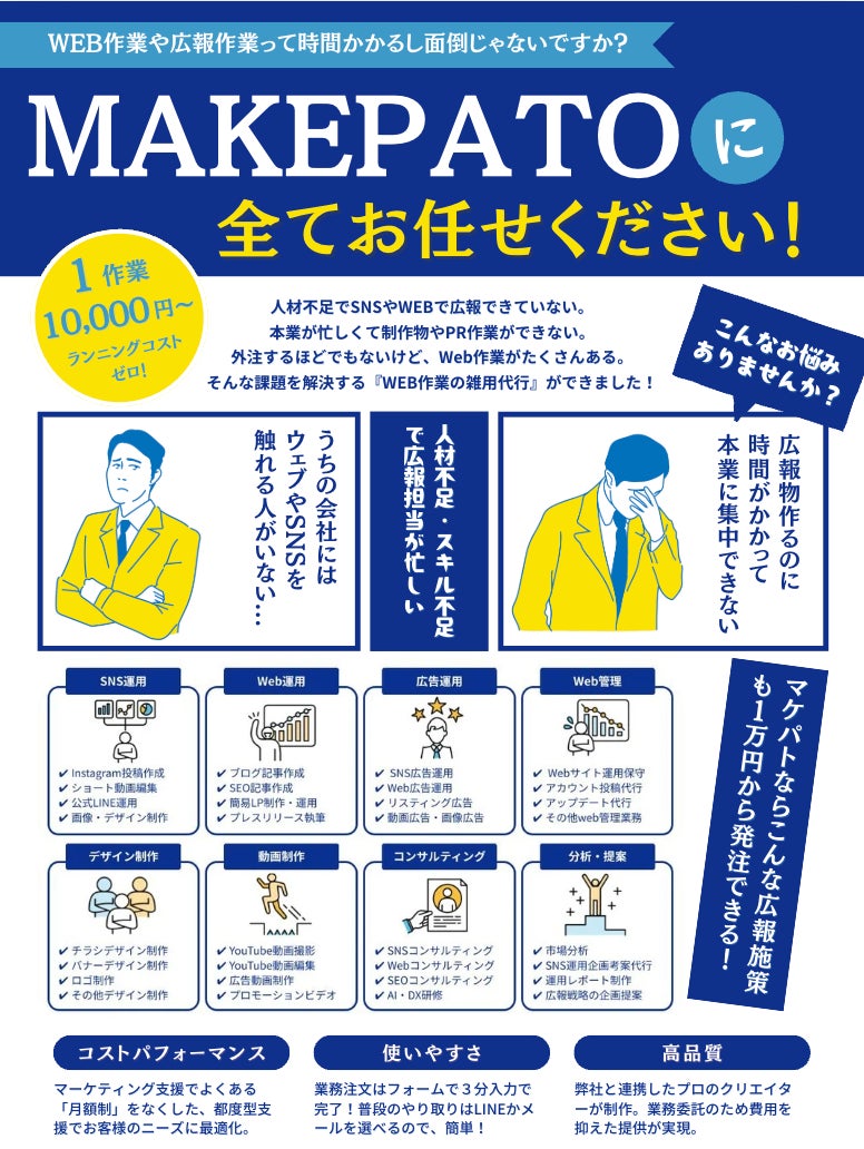 「MAKEPATO」は単なる業務代行ではなく、企業ごとの課題に寄り添い、効果的なマーケティング支援を提供します。SNS運用、広告作成、SEO記事作成、デザイン制作など幅広い業務に対応し、貴社の成長を強力にサポートします。