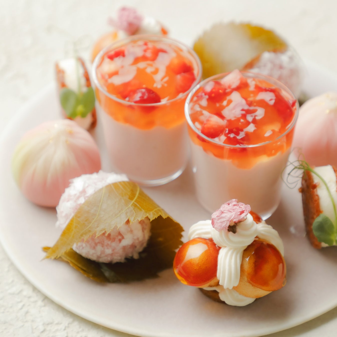 (1枚目)桜サントノレ、桜餅、あまおういちごのムース、酒粕発酵柚子サンド、春分の上生菓子