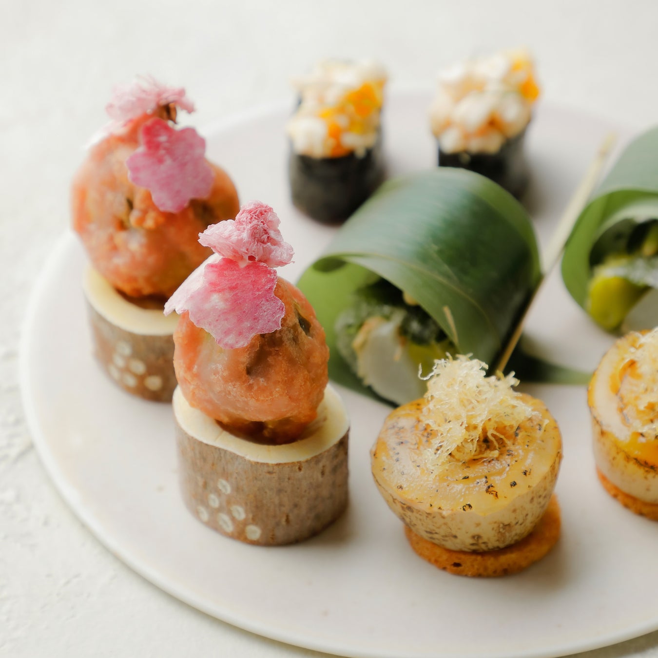 (2枚目)鰆のリゾット軍艦巻き、蕗の薹のベニエ、豚生姜焼き ペコロス、筍春巻き