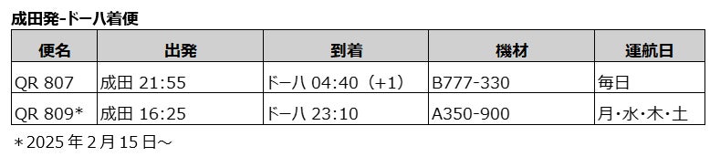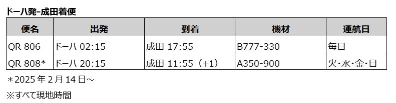 2025年2月14日(金)以降の成田-ドーハ間のフライトスケジュールは以下のとおりです。