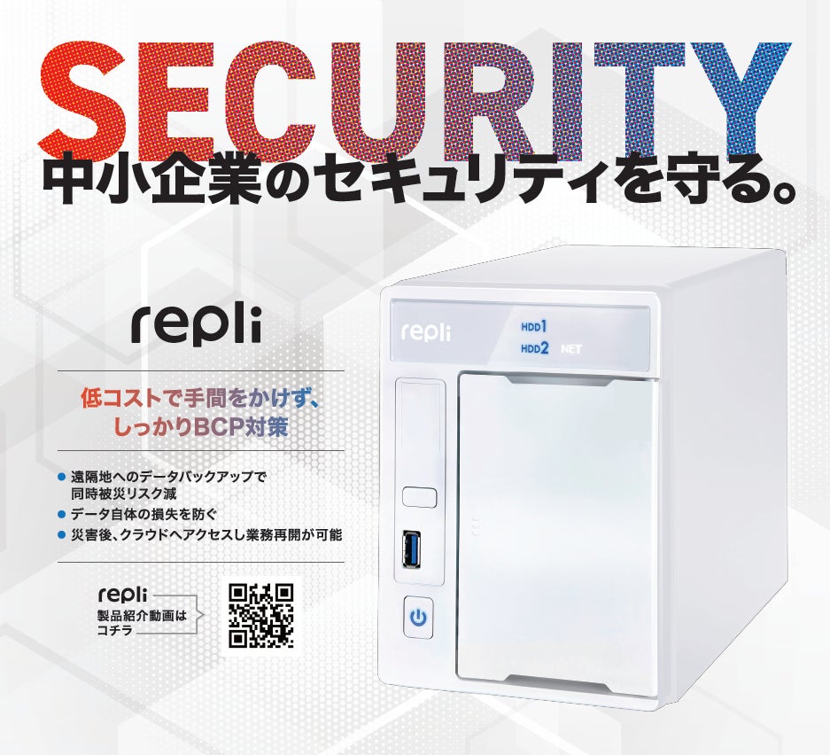 Repliは、昨今複雑化するサイバー攻撃からデータを守りながら、BCP対策も行うことができるNASサービスです。これ1台で専用のファイルサーバーとクラウドがフルセットで揃う、今までにないNASサービスです。社内・社外どこからでもアクセスできるため、中小企業のリモートワークでのご利用はもちろん、万が一の災害発生時も、すぐにデータアクセスできる環境を整えることができるため、BCP対策にもご利用いただけます。