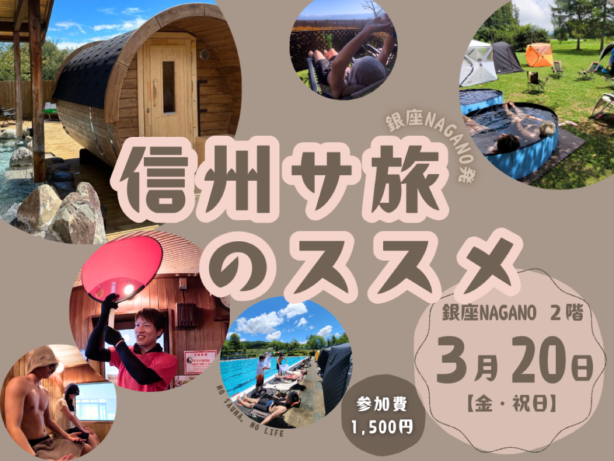 そうした中、銀座NAGANOでは、信州の自然とサウナ文化を体感できるイベント『信州サ旅のススメ』を開催します。本イベントでは、長野県内で活躍する熱波師や、信州サウナ同盟のメンバーが登場し、“自然 × サウナ” が生み出す信州ならではのサ旅スタイルを余すことなく紹介します。