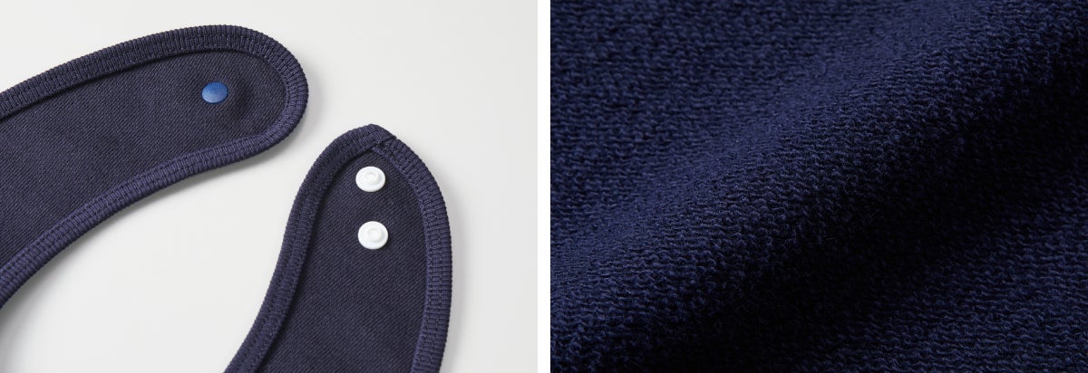 襟首にはスナップボタンがあり、2段階での調節が可能です。着脱もしやすく、さまざまな体格の赤ちゃんにもフィットします。