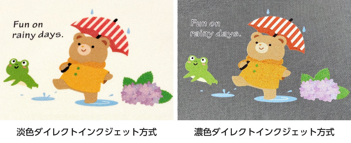 ・淡色ダイレクトインクジェット方式…淡色の生地に適した印刷方式です。CMYK4色のインクを使用して生地に直接印刷します。生地カラーに馴染んだ落ち着いた色合いの仕上がりが特長です。