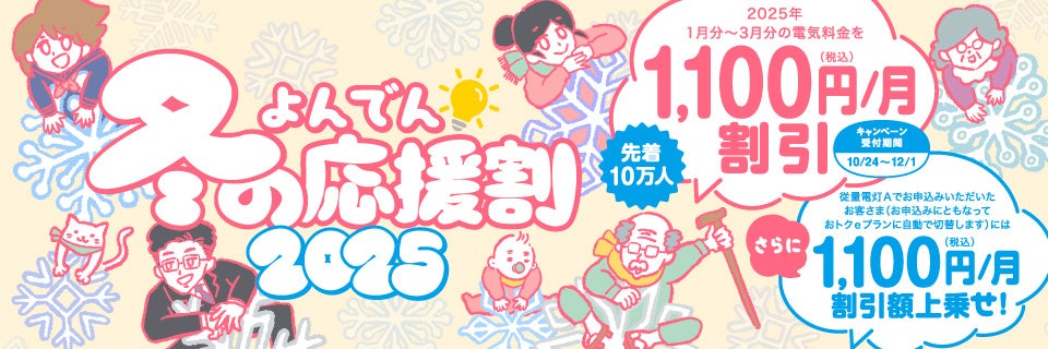 こうした取り組みの一環として、今冬についても、お客さまの暮らしを応援できるよう、「よんでん冬の応援割2025」キャンペーンを実施することとしましたので、お知らせいたします。