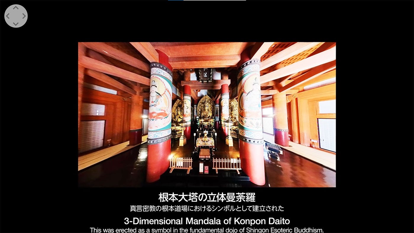 高野山観光の入り口である大門から始まり、奥之院とならぶ高野山の二大聖地のひとつ、壇上伽藍から金剛峯寺までの道を辿ります。観光客からも人気の高い壇上伽藍を歩いて巡るこのVR動画では、建造物や展示物の随所にキャプションが表示され、視聴者の高野山に対する知識・理解を深める内容になっています。(堂内など撮影禁止区域は静止画にて紹介)