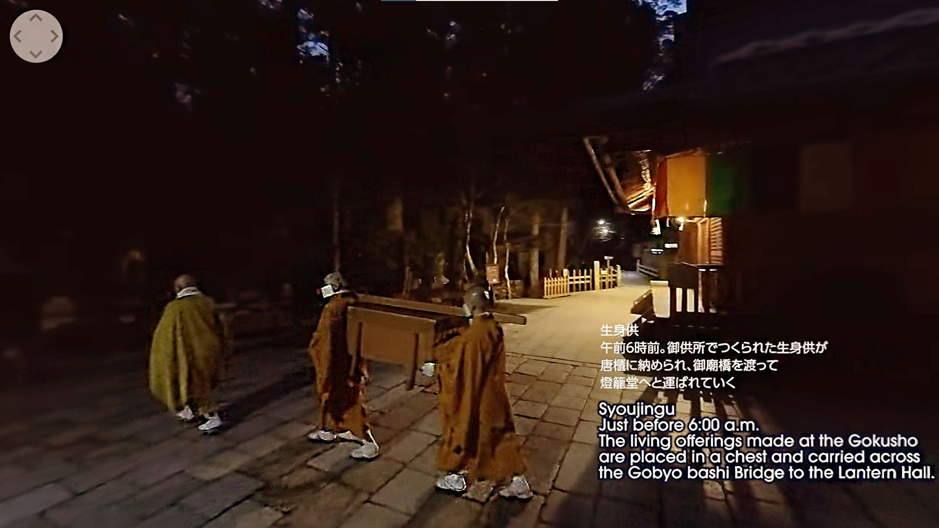 動画の始めには、普段の参拝ではなかなか目にすることのない生身供(しょうじんぐ)の儀式も収録。毎朝、行法師によって弘法大師さまへお食事を届けるこの儀式は、1200年間絶えることなく続いています。雪解けの清澄な空気漂う参道を御廟橋前まで辿るVR映像で、まるで実際に参道を歩んでいるかのような心静かな時間を体験いただくことができます。(※御廟橋より先は撮影禁止区域のため、動画での紹介は橋前までとなります)