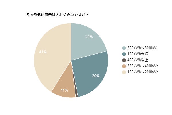 冬の電気使用量で多かった回答として、「100kWh~200kWh」が41%で最も多く、次に多かったものとして、「100kWh未満」が26%という結果でした。全体の約76割が200kWh以下の電気使用量となっています。