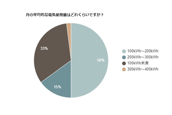 月の平均的な電気使用量について調査したところ、「100kWh~200kWh」が全体の50%を占め、「100kWh未満」が33%、「200kWh~300kWh」が15%との結果になりました。