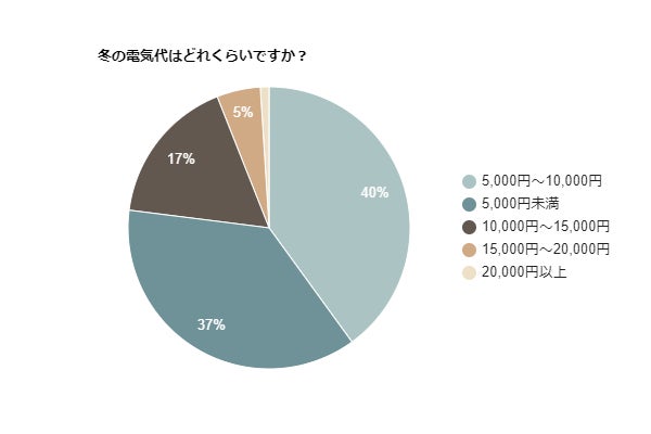 冬の電気代で一番多く回答が集まったのは、「5,000円~10,000円」で40%でした。次に多かったのは「5,000円未満」で37%、次点で「10,000円~15,000円」で17%となりました。