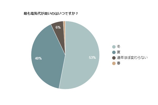 最も電気代が高い季節について質問したところ、「冬」と回答した方が53%で最多となり、「夏」と答えた方は40%でした。