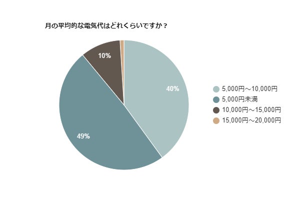 月の平均電気代について調査したところ、「5,000円未満」と回答した方が49%、「5,000円~10,000円」が40%という結果となりました。