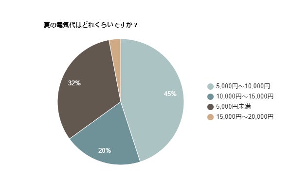 夏の電気代がどれくらいかを調査したところ、「5,000円~10,000円」が45%で最も多く、次点で「5,000円未満」が32%、「10,000円~15,000円」が20%という結果となりました。