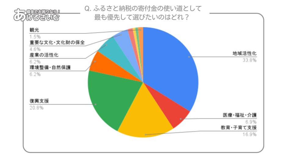 この円グラフは、「ふるさと納税の寄付金の使い道として最も優先して選びたいのはどれ?」という質問に対する回答結果を示しています。内訳は以下の通りです。