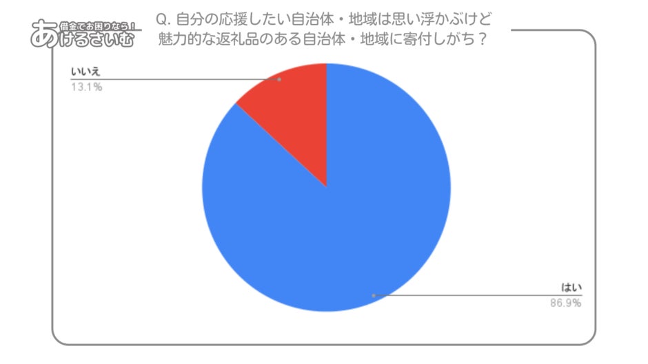 はい (86.9%)という回答が全体の約8割となり、 圧倒的多数の人が、応援したい自治体や地域があるものの、最終的には魅力的な返礼品がある自治体に寄付をすることが多いと回答しています。