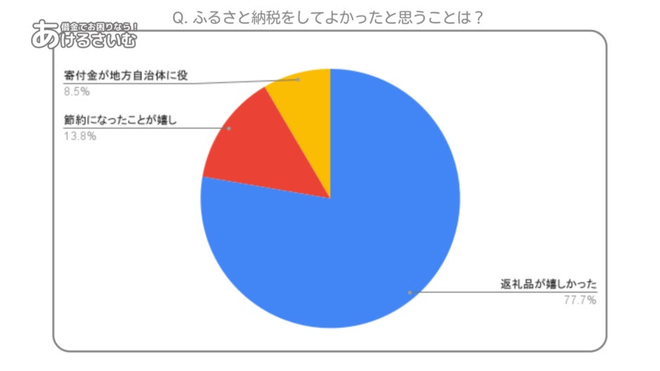 節約になったことが嬉しい (13.8%): ふるさと納税を通じて税金の一部が控除される仕組みが、節約に繋がっている点を評価している人々が一定数存在します。