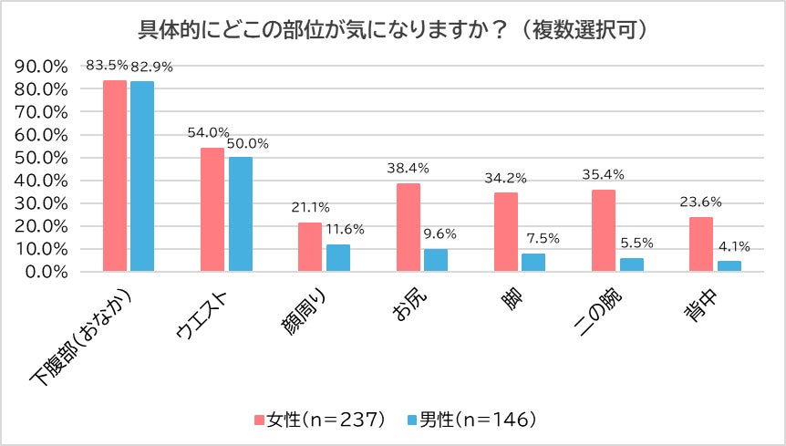 ・男女ともに最も気になる部位は「下腹部」、次いで「ウエスト」