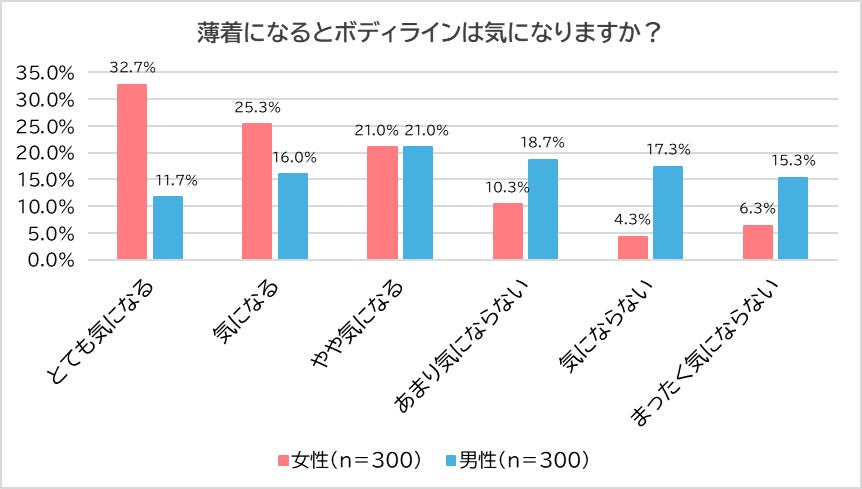 「薄着になるとボディラインは気になるか?」という質問に対し、女性では「とても気になる」(32.7%)と答えた人が最も多く、次いで「気になる」(25.3%)、「やや気になる」(21.0%)と続きました。この結果から、女性の79.0%が何らかの形でボディラインを気にしていることがわかります。一方で男性では、「やや気になる」(21.0%)が最も多く、次いで「あまり気にならない」(18.7%)、「気にならない」(17.3%)、「まったく気にならない」(15.3%)と続き、ボディラインを気にしている男性は48.7%でした。これにより、女性の方が男性よりもボディラインを意識する傾向が強いことがわかりました。