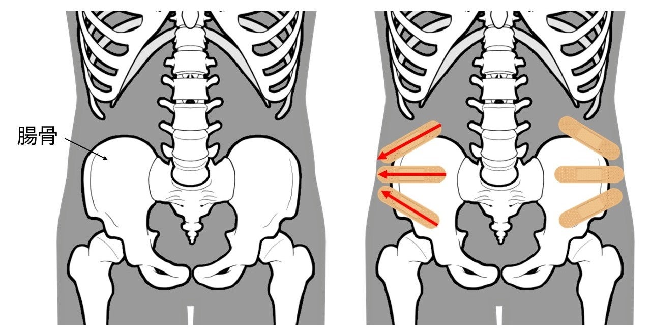 上記の3か所とも軽く皮膚を引っ張って腸骨をまたぐように貼ることで、腹横筋が内側にキュッと収縮して活性化されます。貼った直後にじんわり温かく感じたり、お腹が引き締まる感覚を覚えたりする人もいるかもしれません。反対側も同様に貼りましょう。