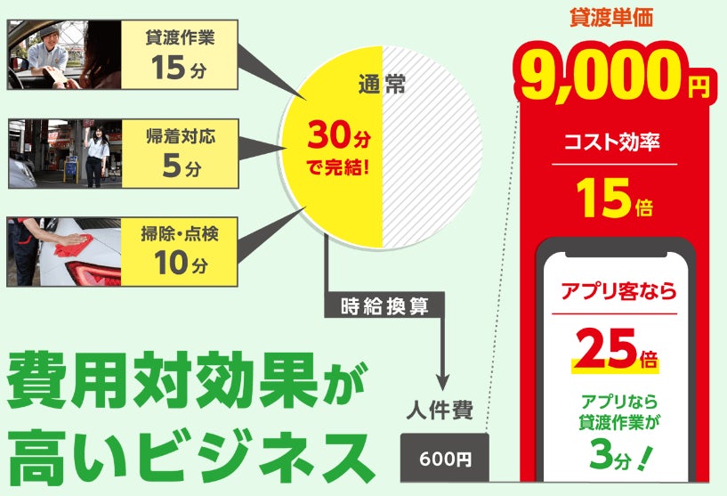 「人が働かない間に車が稼いでくれる」のがレンタカービジネスです。レンタカー業務に必要な時間は、貸渡1回あたり30分。スタッフの時給が1,200円とすると、人件費は600円相当です。ニコレンの貸渡単価は約9,000円なので、人件費に対するコスト効率は15倍。アプリ利用の場合、さらに時間が短縮され25倍となります。