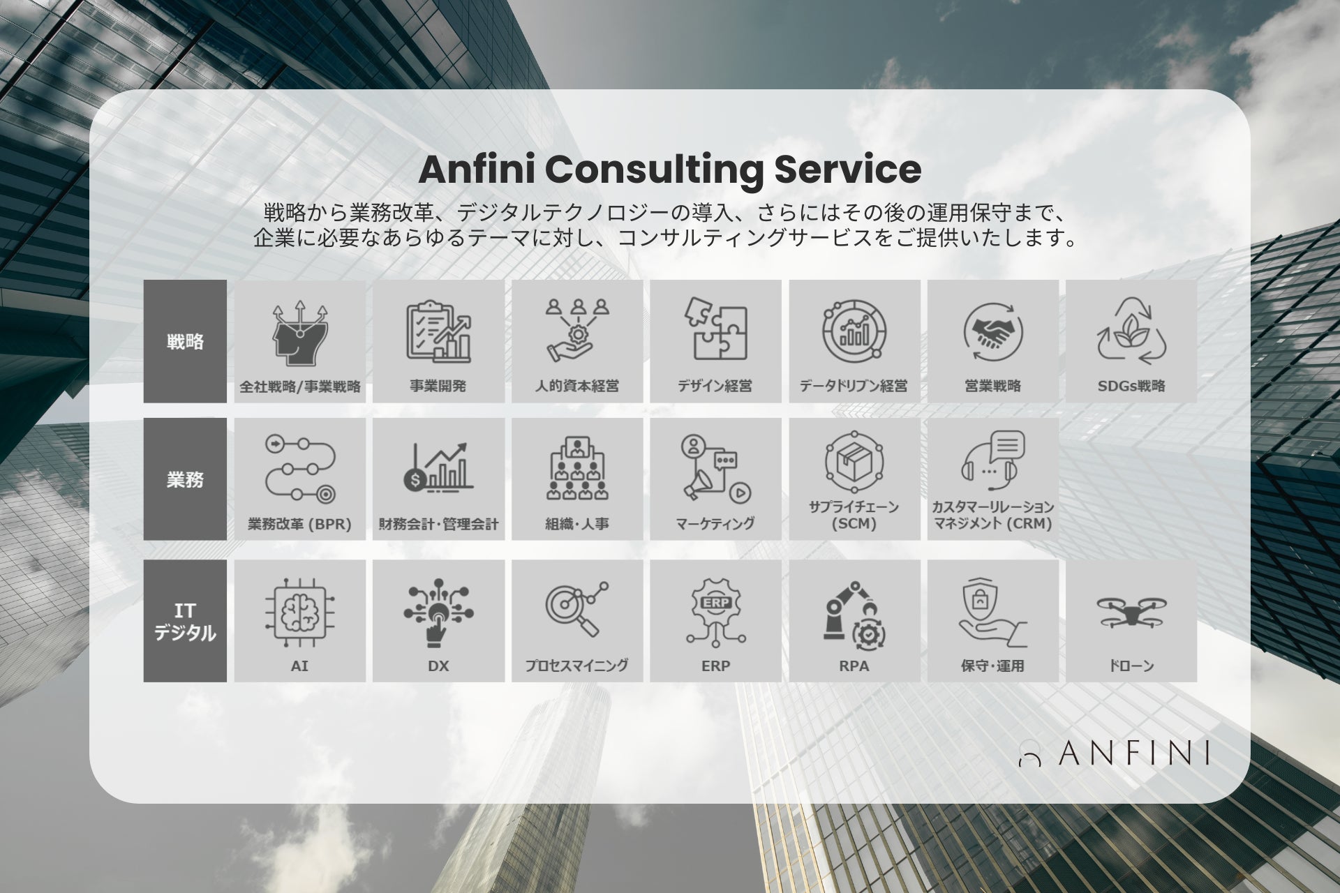 株式会社Anfiniは、2021年の創立以来「Consultants First」を掲げ、戦略策定からITソリューション導入まで、企業様の成長を支援する幅広いコンサルティングサービスを提供してまいりました。
