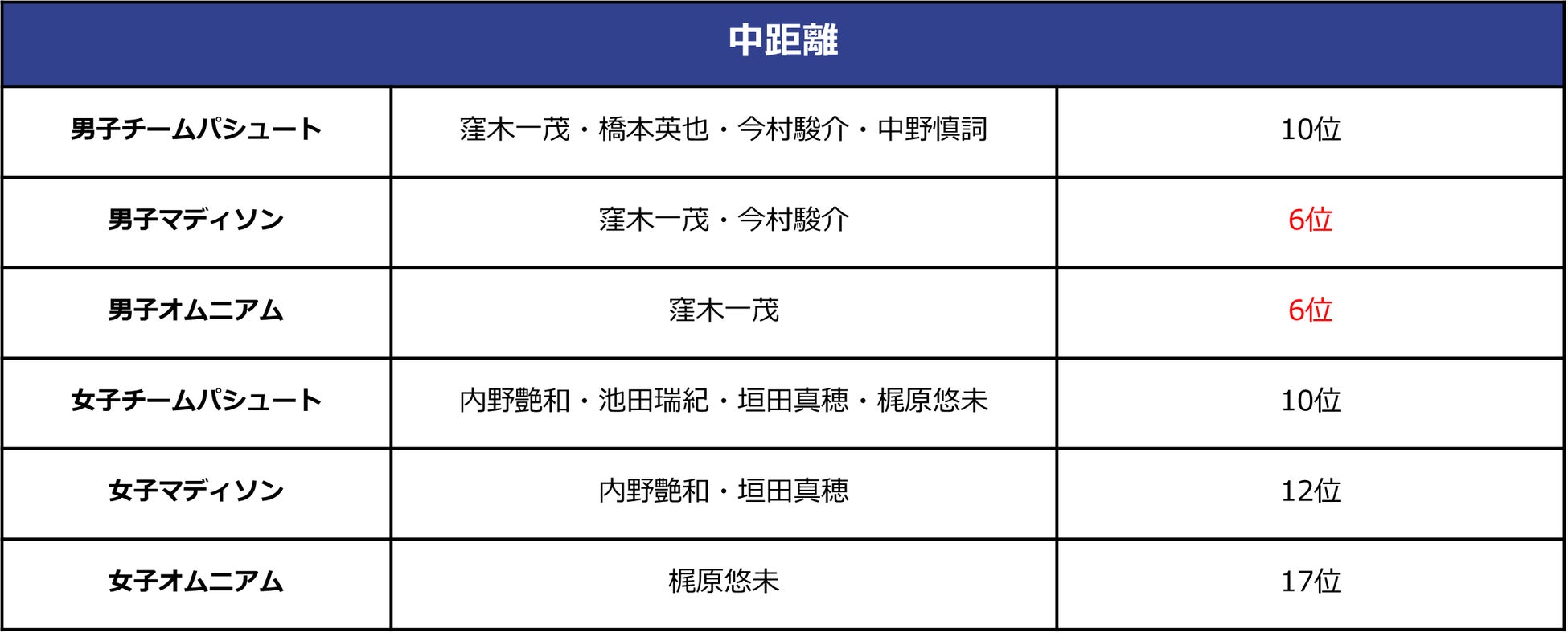 短距離では男子チームスプリントや女子ケイリンのほか、男子スプリントにて小原佑太選手が6位、太田海也選手が7位となりました。中距離では男子マディソンにて窪木一茂選手・今村駿介選手が5位入賞、男子オムニアムにて窪木一茂選手が6位入賞を果たしました。