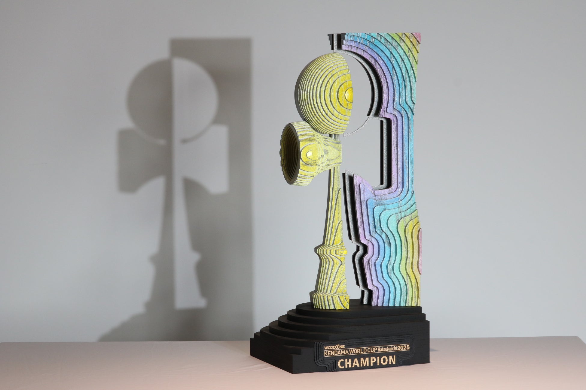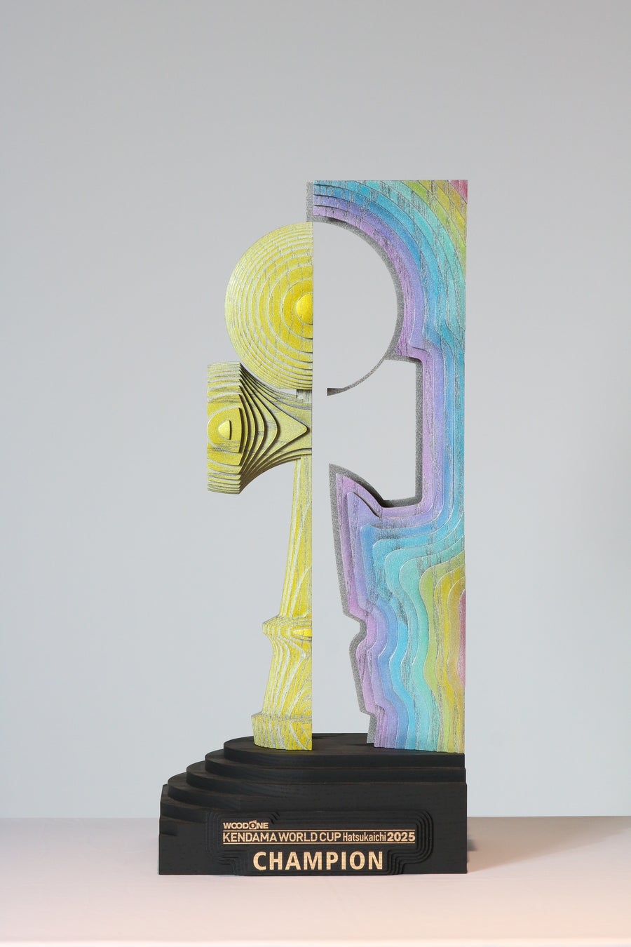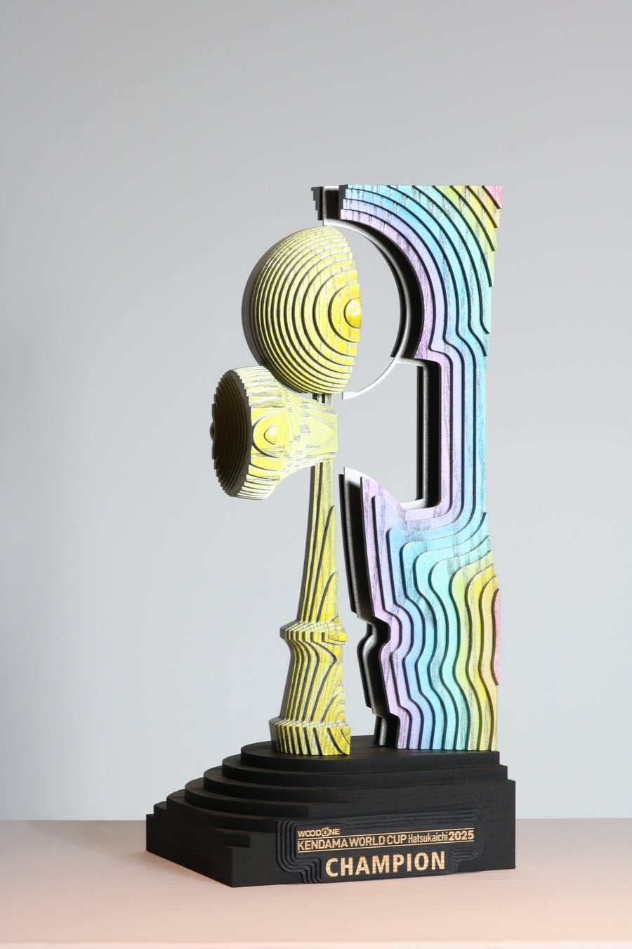 このたび、けん玉ブランド「MUGEN MUSOU」を展開する株式会社イワタ木工(本社:広島県廿日市市、代表取締役社長:岩田知真)は、2025年11月15日および16日に広島県廿日市市で開催される「ウッドワンけん玉ワールドカップ」の優勝トロフィーを製作いたしました。けん玉ワールドカップのトロフィーの製作は、今年で11回目となります。