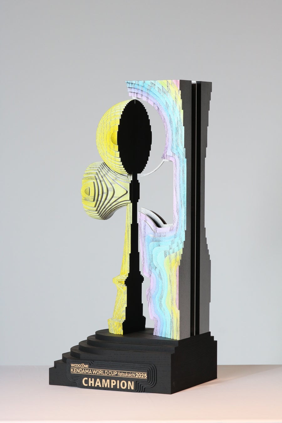 2025年ウッドワンけん玉ワールドカップの優勝トロフィーを広島県の株式会社 イワタ木工が製作