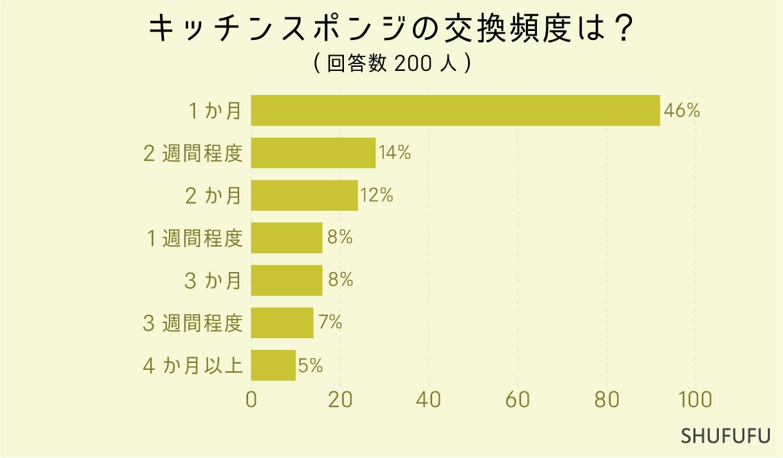 200人にキッチンスポンジに関するアンケート調査を行った所、交換頻度は「1か月」と答える人が最も多かったです。