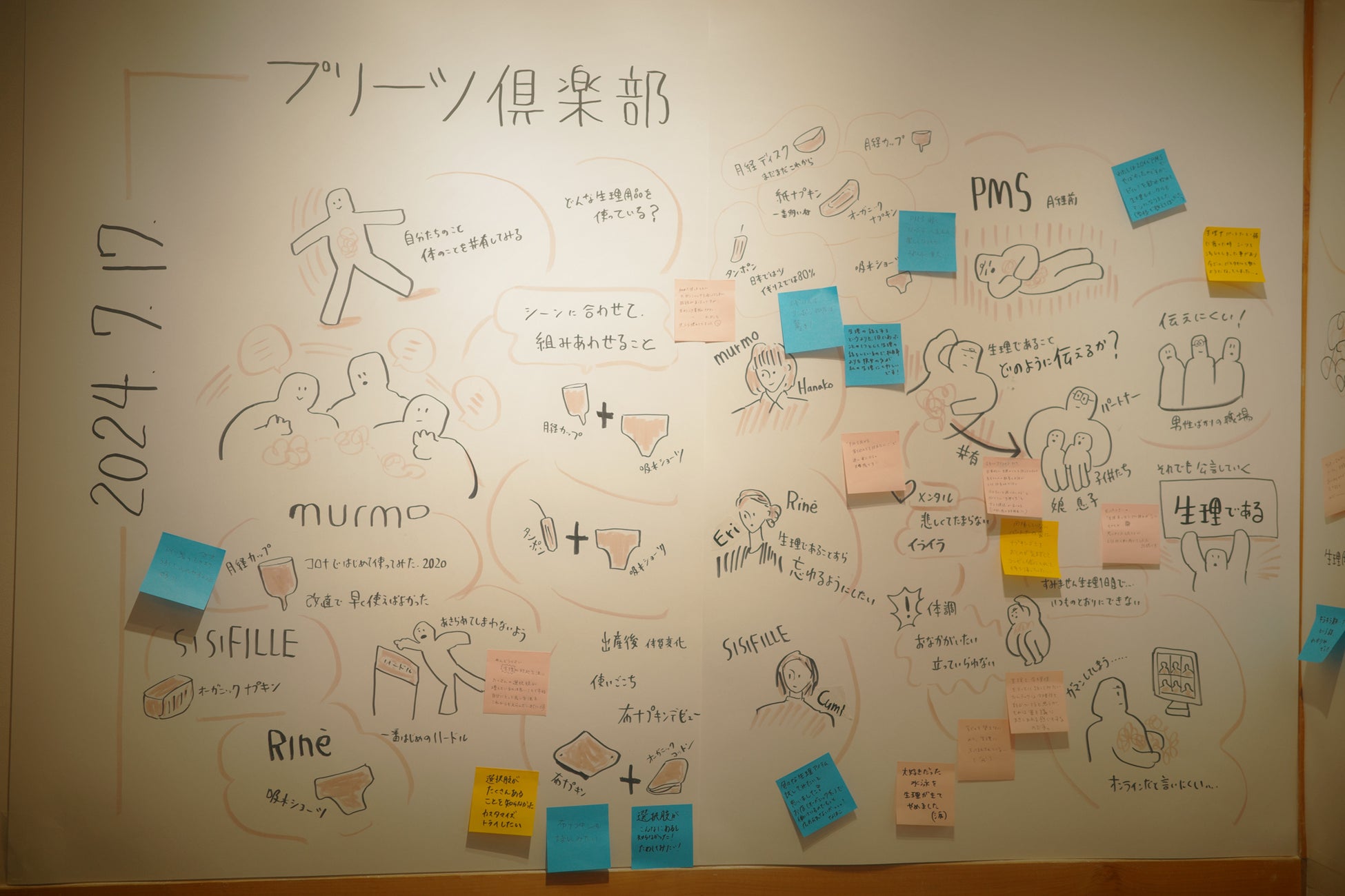 株式会社murmur (マーマー)が展開するオリジナル日本製月経カップを軸とした生理用品ブランド「murmo/マーモ」は、株式会社パノコトレーディングによる生理用ナプキンをはじめとしたオーガニックコットンを使ったアイテムを展開するブランド「SISIFILLE(シシフィーユ)」、株式会社Neithが展開するライフスタイルブランド「Rinē」との3ブランド主催のコミュニティ「プリーツ倶楽部(プリーツクラブ)」を立ち上げ、その第一弾として2024年7月17日に、生理のエピソードを共有し、その対話をグラフィックレコーディングで可視化し記録する、リアルイベントを開催しました。このプレスリリースでは、イベントの様子をお届けします。