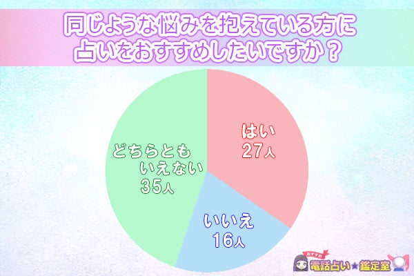 占いを他者に推奨するかについては、意見が分かれており、「はい」と答えた27人、「いいえ」16人、「どちらともいえない」35人という結果でした。