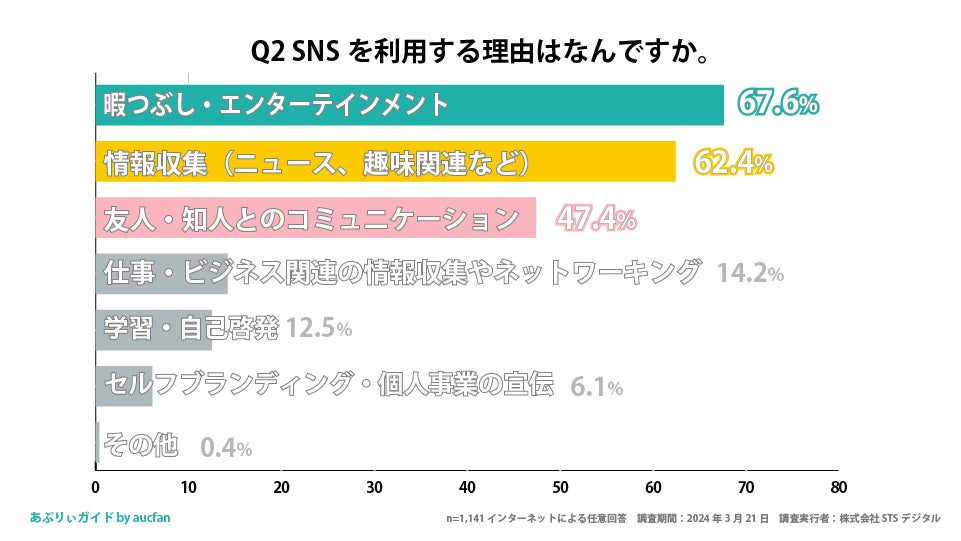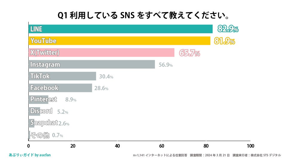 そこで、株式会社STSデジタルと株式会社オークファンが共同運営しているあぷりぃガイド(URL:https://aucfan.com/appguide/)は、20歳〜60歳の男女1141人を対象に「SNSアプリに関するアンケート調査」を実施しました。
