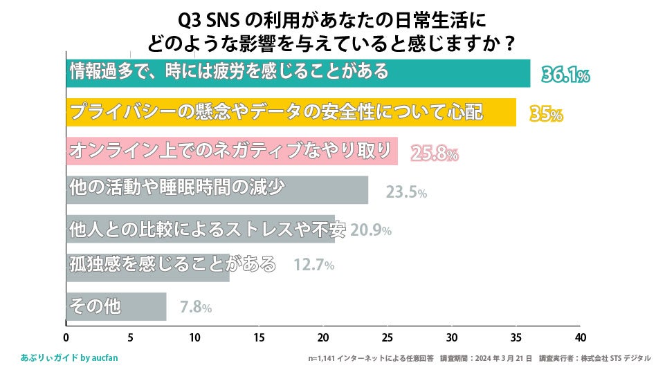 「情報過多で、時には疲労を感じることがある」と回答した人が36.1%、次いで「プライバシーの懸念やデータの安全性について心配することがある」と答えた人が35%でした。