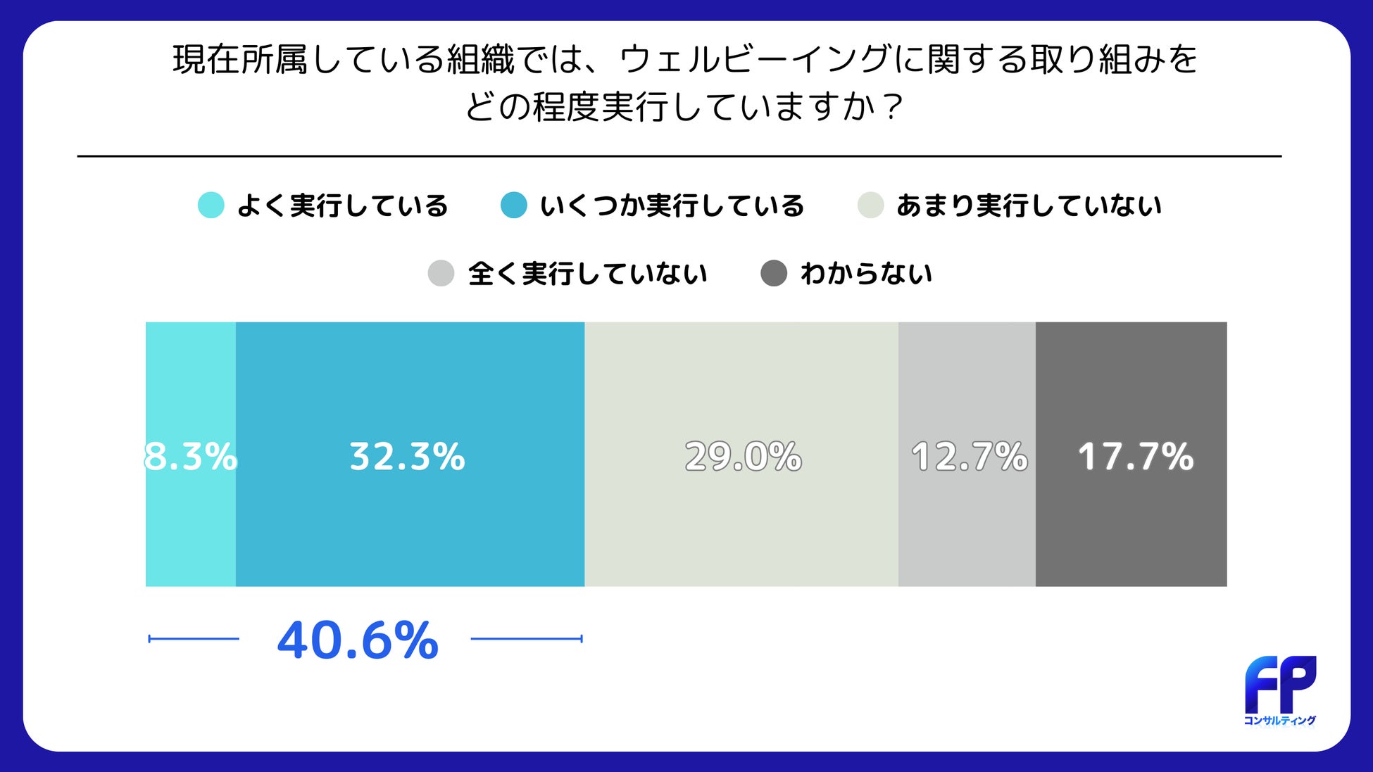 株式会社FPコンサルティング(本社:大阪府大阪市、代表取締役:岡崎謙二、以下FPコンサルティング社)は、企業の人事担当者を対象にウェルビーイングに関する意識度調査を実施いたしましたことをお知らせいたします。近年、心身の健康やモチベーション、生産性の向上を重視する企業が増える中、ウェルビーイングは経営課題の一つとして注目されています。本調査では、約8割の方がウェルビーイングの重要性を認識し、今後の取組みの必要性を感じている一方で、具体的な実践には課題があることが明らかになりました。