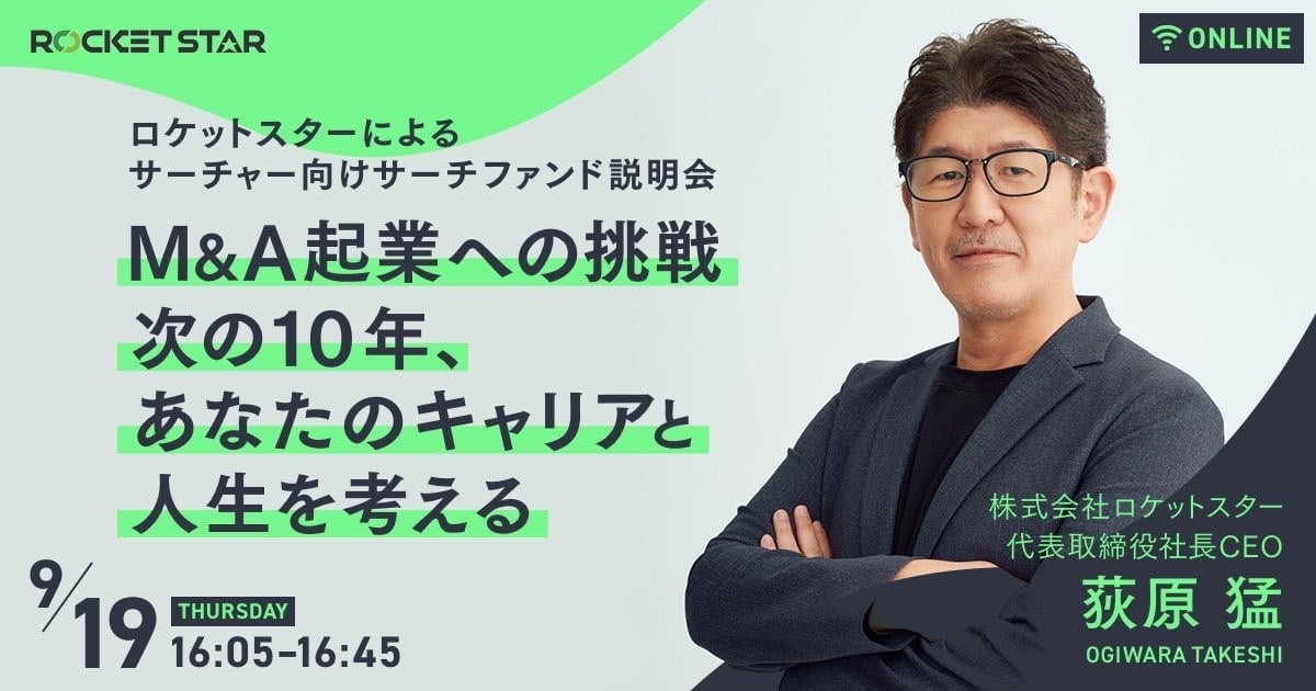 本セミナーでは、ロケットスターの代表取締役社長CEOである荻原猛が登壇し、サーチファンドとサーチャーによるM&A起業ついてお話します。起業や経営に興味のある方々が、40〜50代に向けて次のキャリアや人生を考えるきっかけになればと考えております。