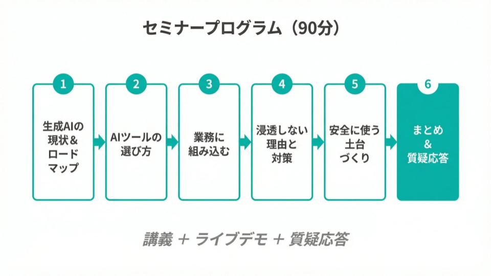 「AI導入を失敗させる2大NGパターン」として、(1)とりあえず見放題AI研修を導入するケースと、(2)いきなり数百万規模の大型研修を発注するケースを取り上げ、なぜこれらが「経営層と現場の分断」を招くのかを構造的に解説しました。あわせて「経営者・幹部自身がまずAIを使いこなすことが、全社的な浸透の前提条件である」というメッセージを伝えました。