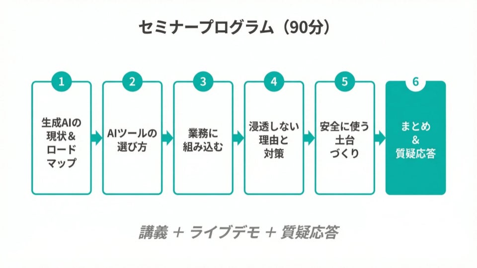 情報漏洩リスク、政府のAIガイドライン、無料ツールの限界、セキュリティ対策、従業員教育のポイントなど、中小企業がAIを安全に活用するための基盤づくりを解説しました。