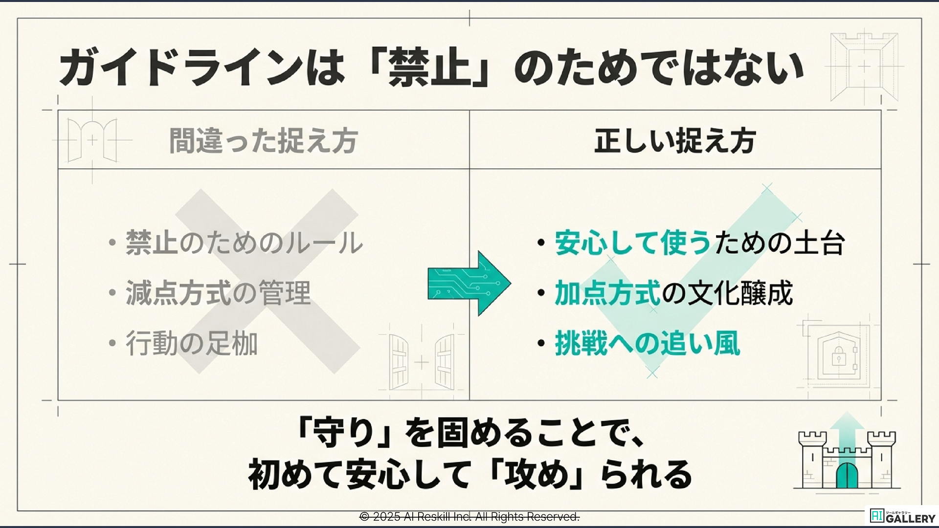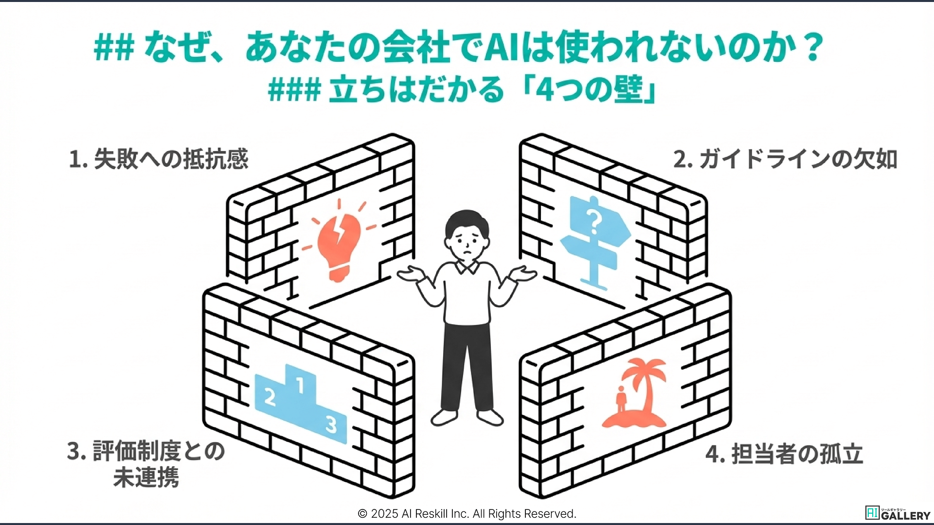 一方で、目的があいまいなまま見放題型のAI研修を導入したり、いきなり数百万円規模の大型研修を外注したりする「NG導入パターン」も広がっています。こうした導入は、学んだ社員が「めっちゃ勉強になった」と満足する一方で業務は1ミリも変わらず、経営層と現場の間に深刻な「分断」を生むリスクがあります。