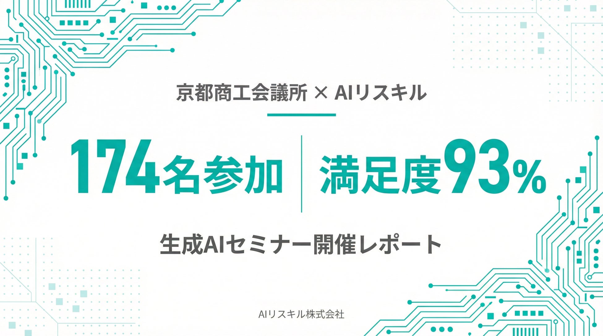 AIリスキル株式会社(本社:大阪市北区、代表取締役:山原慎也)が京都商工会議所で生成AIセミナーを開催しました。2025年12月3日に開催した「多様化する生成AIの選び方と安全な活用法」には、対面45名・動画視聴129名の計174名が参加。5段階評価のアンケートでは「不満」の回答がゼロ、全体の93%が「満足」と回答しました。