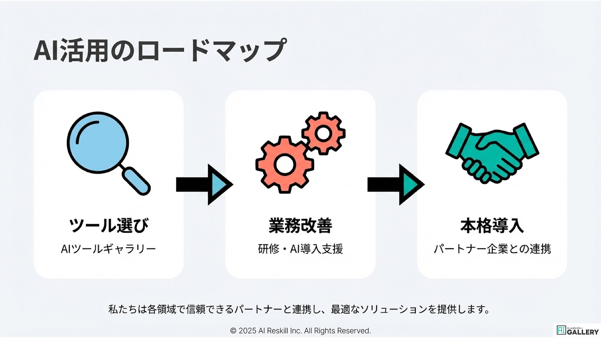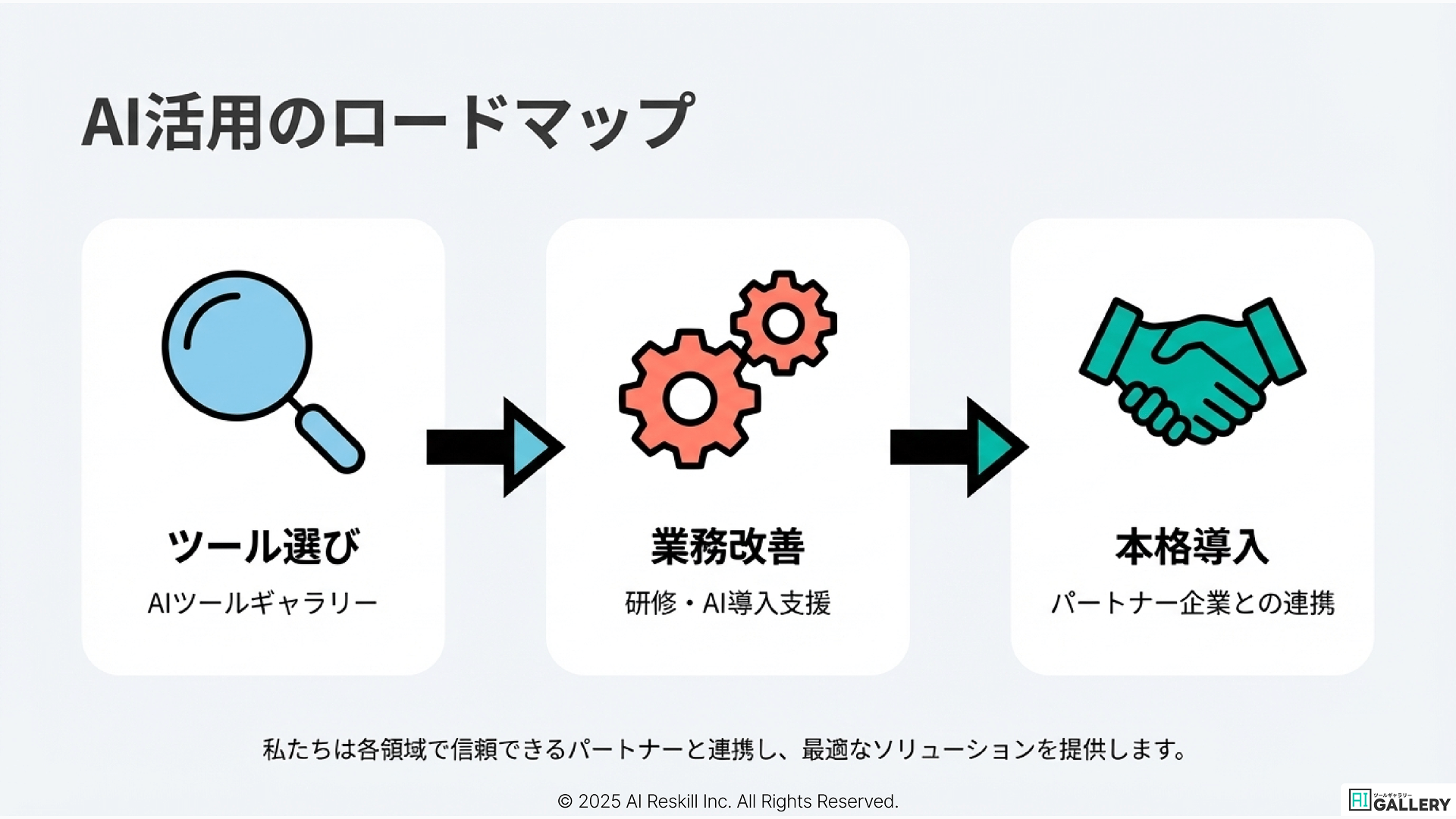AIリスキル株式会社は、生成AIを活用したコンテンツマーケティングと事業成長支援を主軸とする企業です。日本最大級の生成AIプラットフォーム「AIツールギャラリー」を運営し、記事・動画・データを活用した集客・認知拡大・リード創出を支援しています。加えて、企業・自治体向けに生成AI研修やAI導入・開発支援も提供し、マーケティングと人材育成の両面からAI活用を推進しています。