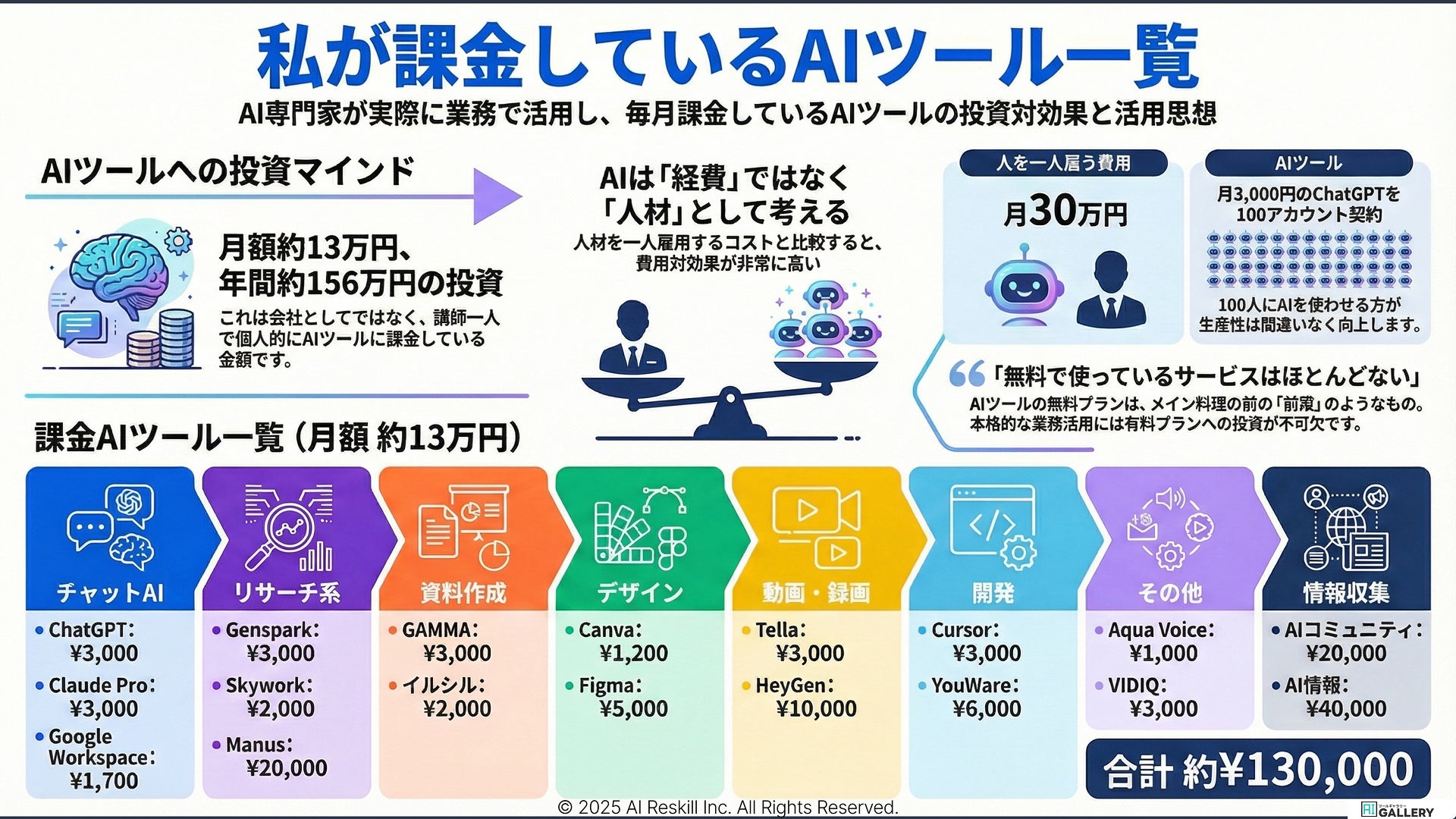 「自分は月額約13万円・年間約156万円をAIツールに投資して比較検証している。その知見をもとに、業種や課題に合ったツールの選び方の軸をお伝えする」と、実践者ならではの視点で解説しました。