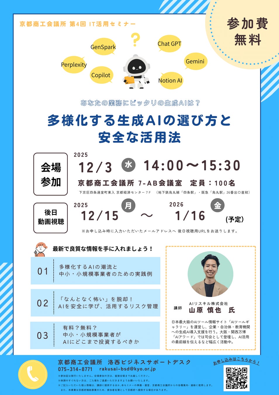 京都商工会議所 洛西ビジネスサポートデスクには、従業員2〜5名規模の小規模事業者からも「AIを活用したいがどこから手をつければいいかわからない」「情報漏洩が心配」といった相談が寄せられていました。同所が当社の運営する「AIツールギャラリー」の活動に注目し、講師依頼をいただいたことで本セミナーが実現しました。当社代表の山原慎也はAIツール600種以上を自費で検証しており、中小企業の業種・課題に応じた「AIの選び方の軸」を提示できる実践者として登壇しました。