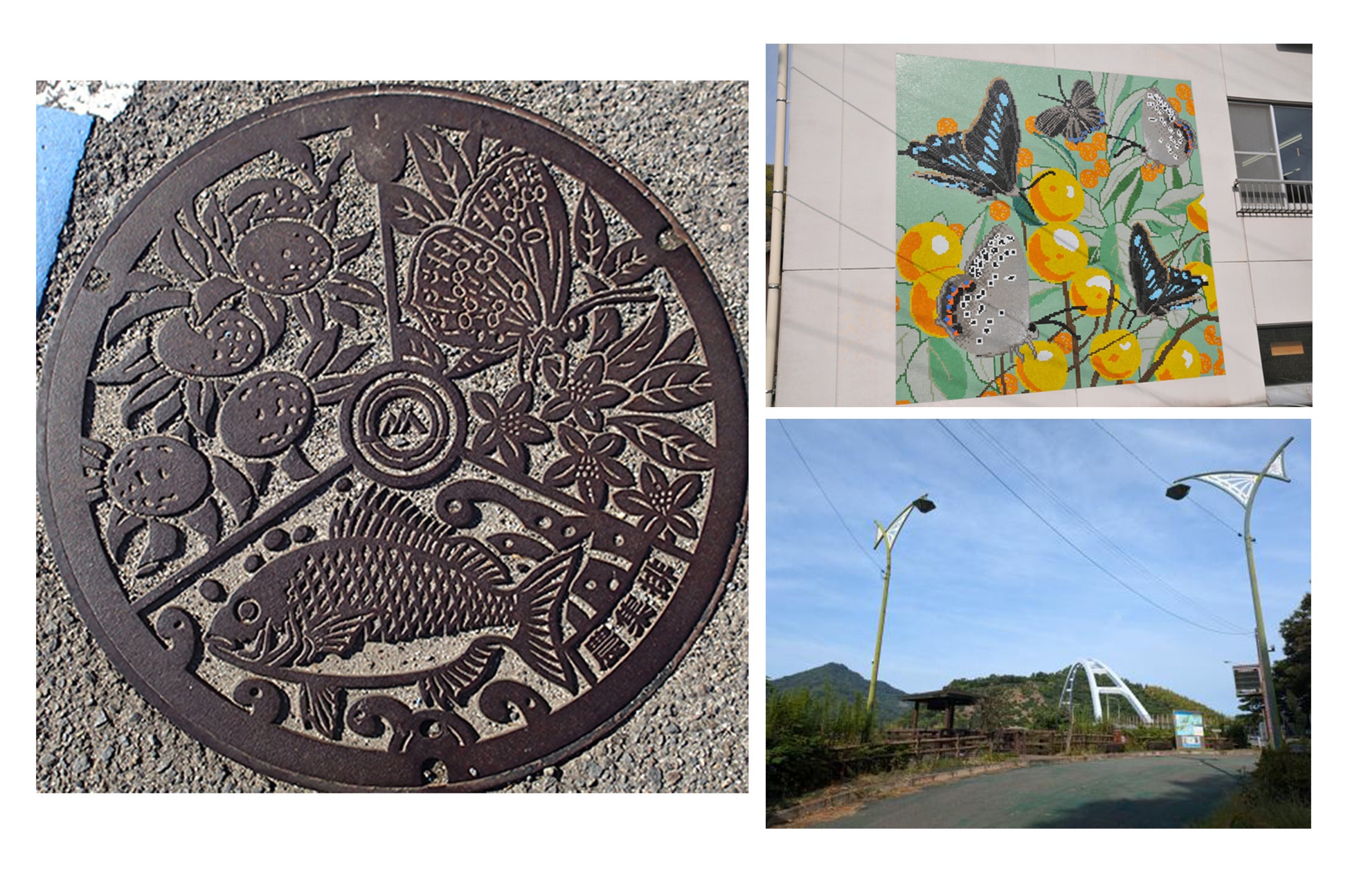 広島県との県境の瀬戸内海に浮かぶ3つの島々からなる人口313人の関前地域。マンホールには、特産のみかんと鯛、平成元年に発見された準絶滅危惧種の”クロツバメシジミ”が描かれています。蝶を起爆剤に地域を活性しようと、「蝶を守る島の会」と「岡村小学校・関前中学校の生徒」は、“クロツバメシジミ”の食草である“ツメレンゲ”の種まき・株分け等の保護活動を36年間続けています。校舎の外壁には、タイル製の蝶のモザイク画が住民によって描かれ、島内には“蝶”をモチーフにしたモニュメントや壁画が多数存在しています。