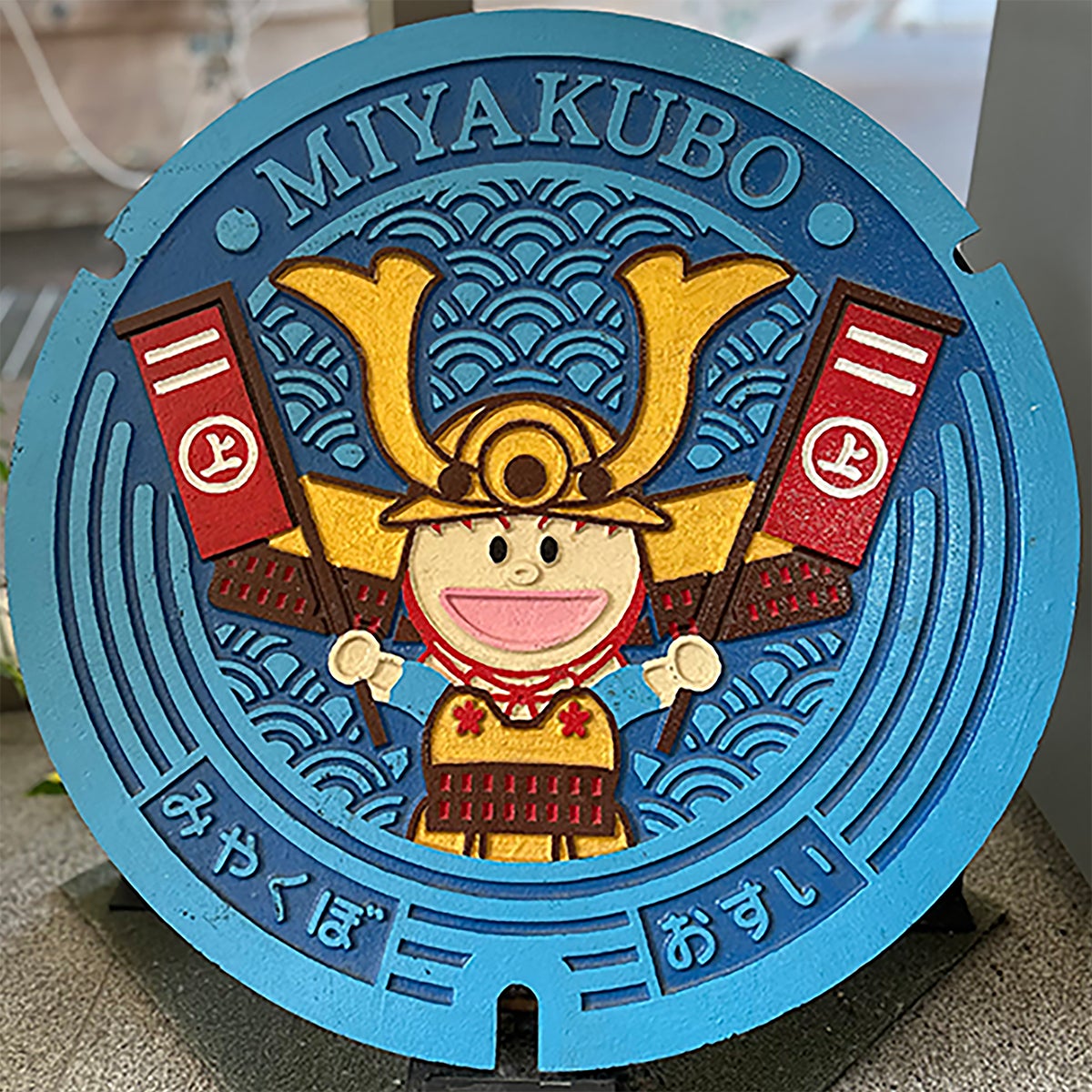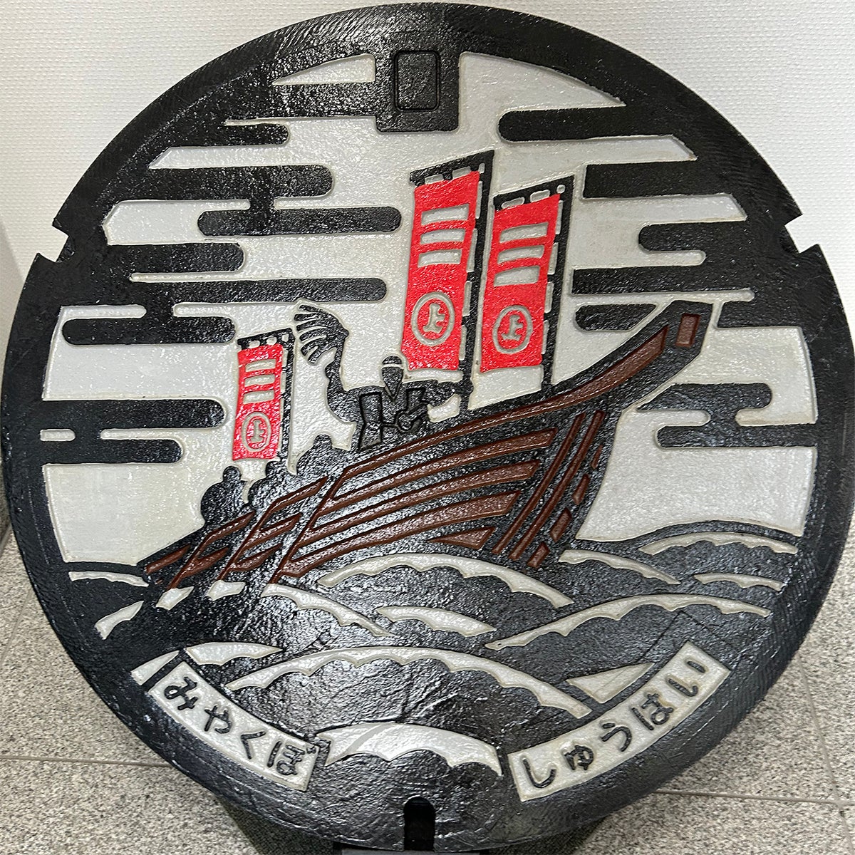 旧宮窪町は、しまなみ海道にある瀬戸内海に浮かぶ大島の北部。その昔ここは能島村上海賊の拠点でした。瀬戸内海には、のちに村上海賊三家と呼ばれる『来島・能島・因島』の村上氏がいましたが、その中でも“日本最大の海賊”と称されたのが、能島村上海賊です。マンホールふたは、家紋の“㊤”が入った船幟を持つ能島城主“村上武吉”がモチーフとなっています。