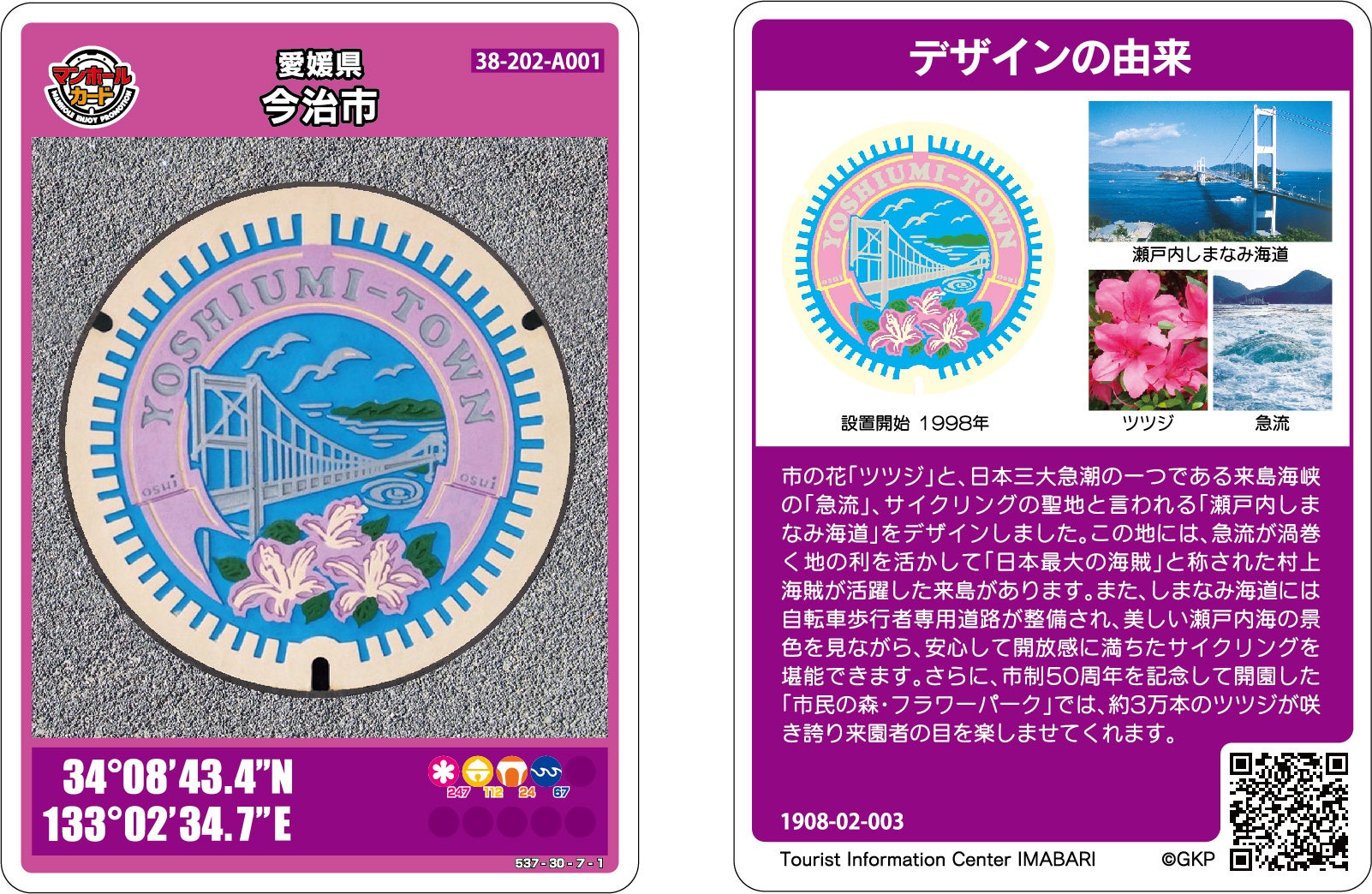 今治市では現在「瀬戸内しまなみ海道」「来島海峡の急流」「市の花ツツジ」をモチーフとしたマンホールカードを 「Tourist Information Center IMABARIイオンモール今治新都市インフォメーションセンター」において配布しています。